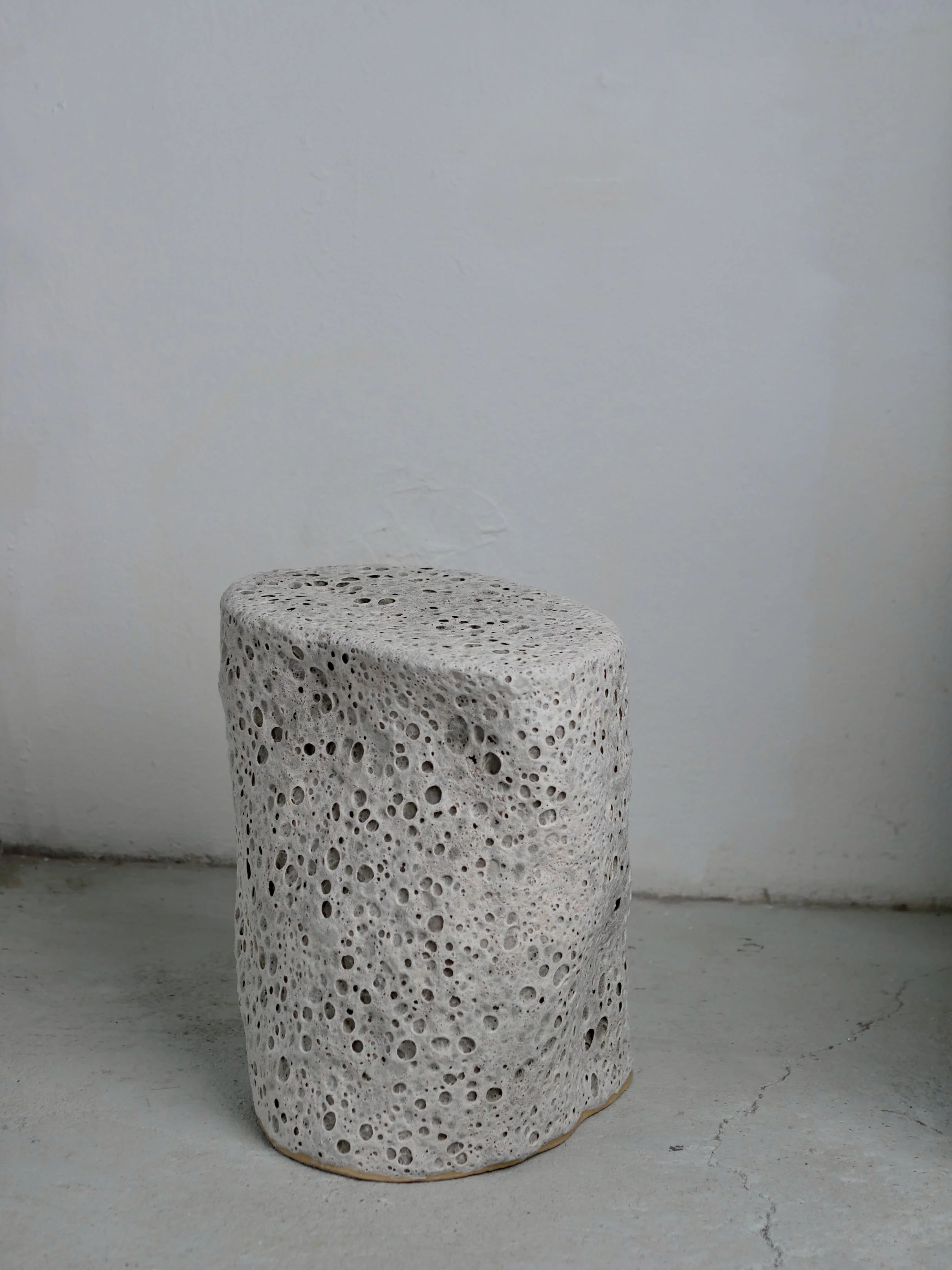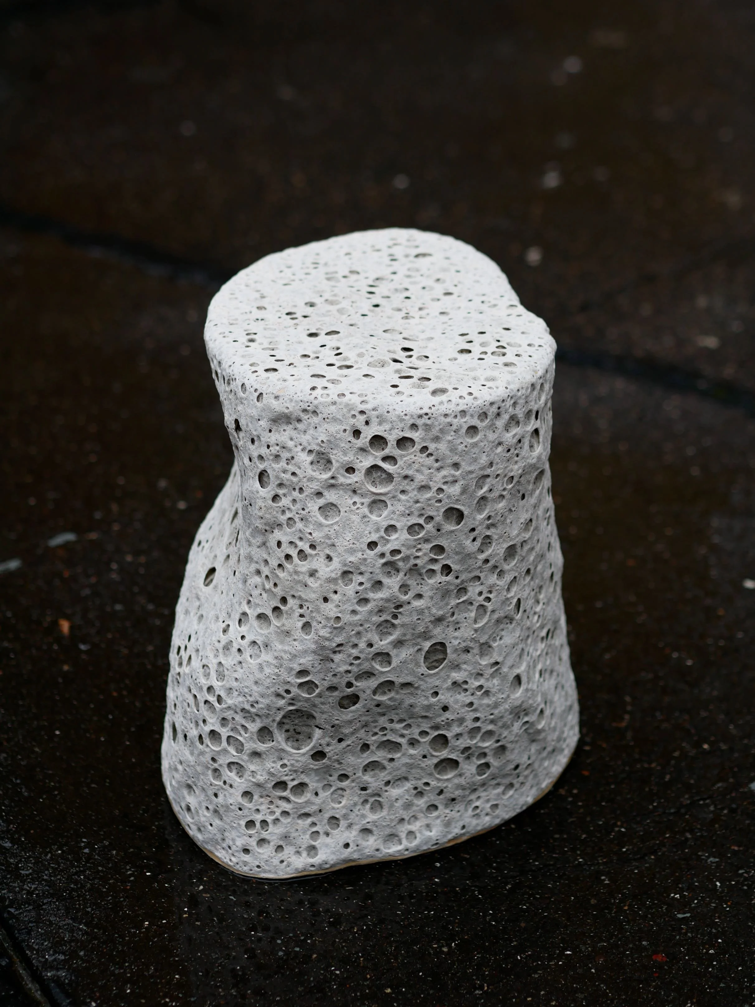 The crater surface of this vase emerges through gases that the glaze develops during the firing that goes up to 1230 degrees. The glaze boils up, forms big bubbles and when cooling down small and big craters remain. It seems like a very thick skin around the clay body.